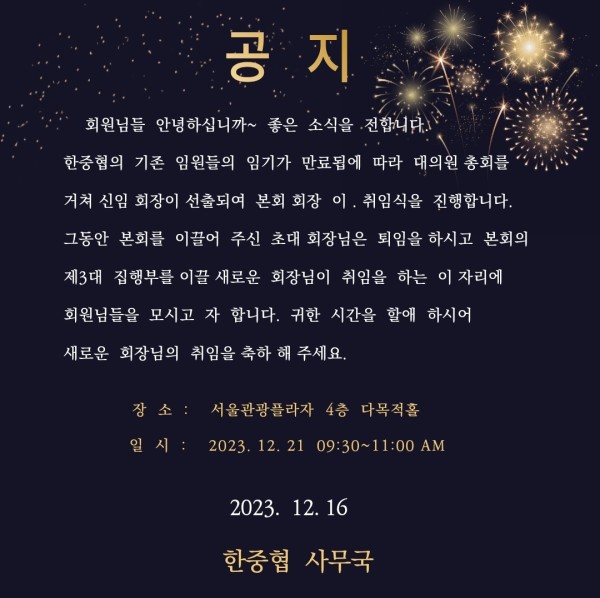 한중협 제 2,3대 회장 이. 취임식 2023년 12월 21일 9:30^11:00 서울 관광재단 4층 다목적홀에서 개최합니다.