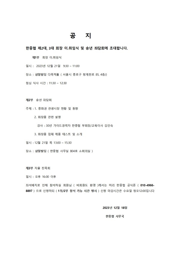한중협 회장 이.취임식 및 송년회 개최 공지 (비회원 도 참석 가능)