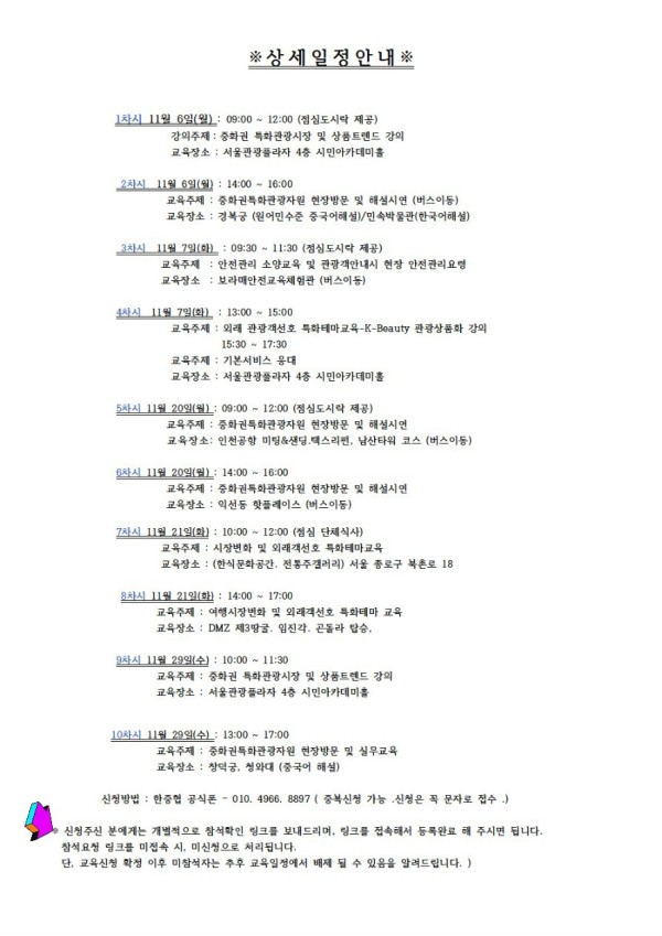 신청 시, 본인성함, 교육 회차, 연락처 등 기본정보를 적어서 다음 연락처: 010-4966-8897로 문자메세지 전송해 주십시오.
